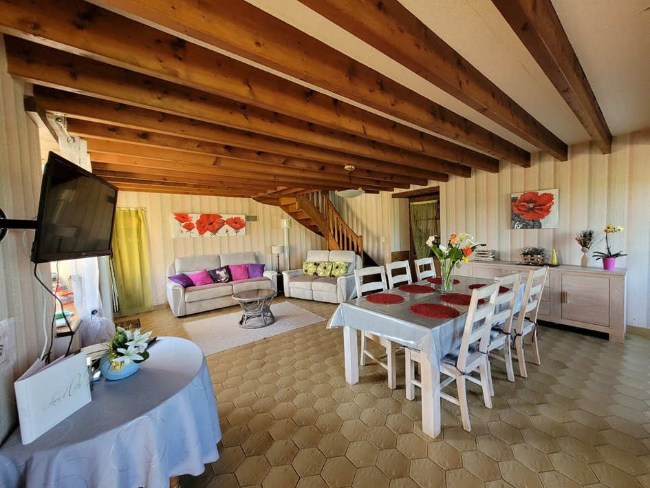 Au rez- de- chaussée, une cuisine intégrée avec équipements électroménagers (four, frigo/congélateur, plaque à induction, lave-vaisselle, micro-onde, lave-linge) ouverte sur une vaste pièce de vie de 40 m2 avec salle à manger et espace détente (2 canapés dont 1 canapé-lit, console de jeux vidéo). Une salle de bain avec baignoire et un wc séparé.
